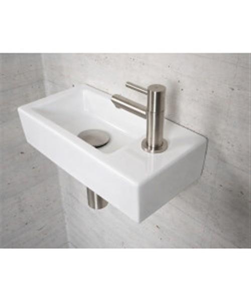De fontein kent verder een glans witte kleur en heeft een rechthoekige vorm. Aan de linkerkant van het fonteintje bevindt zich het kraangat.